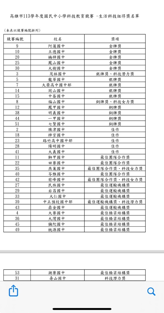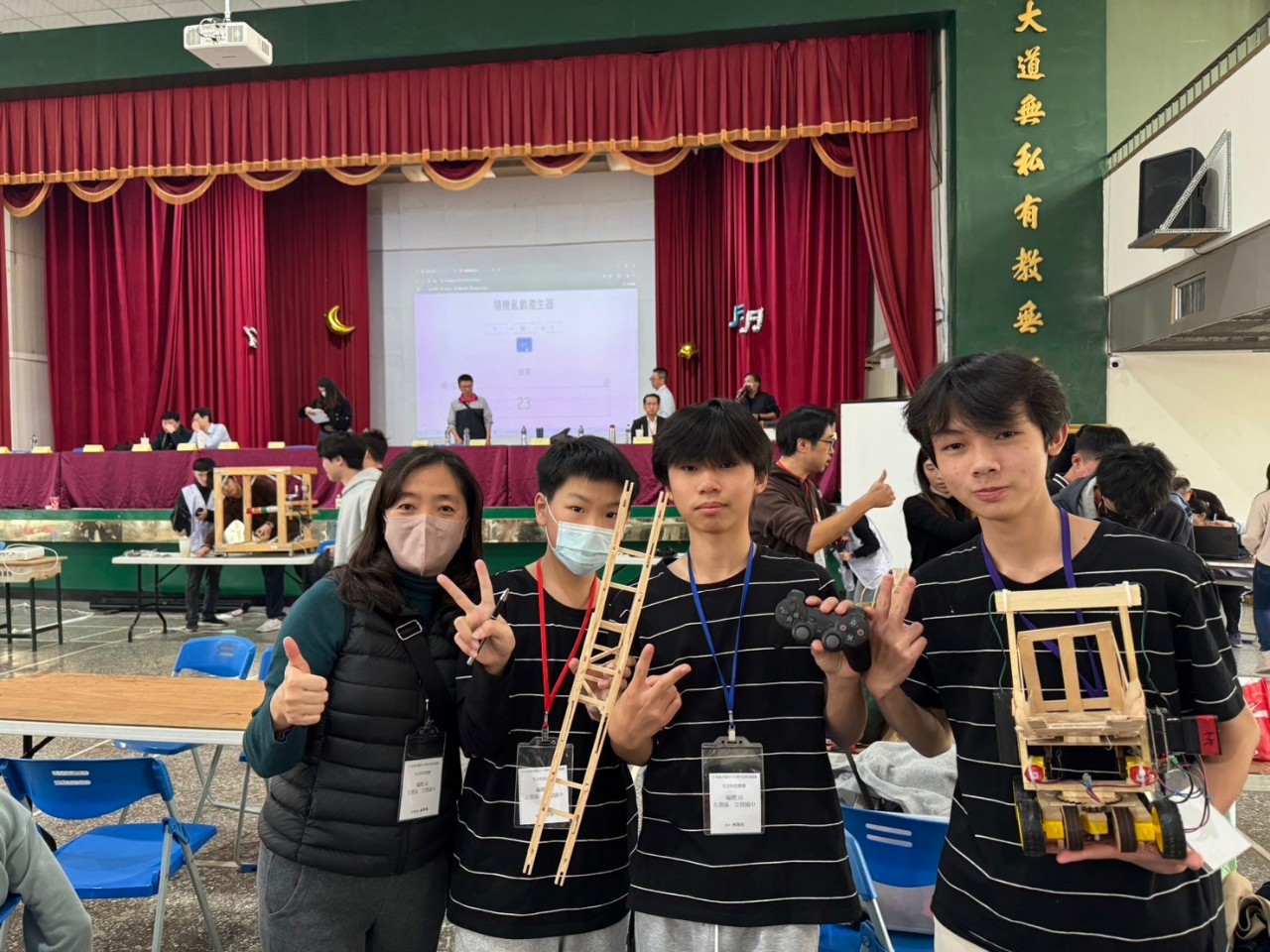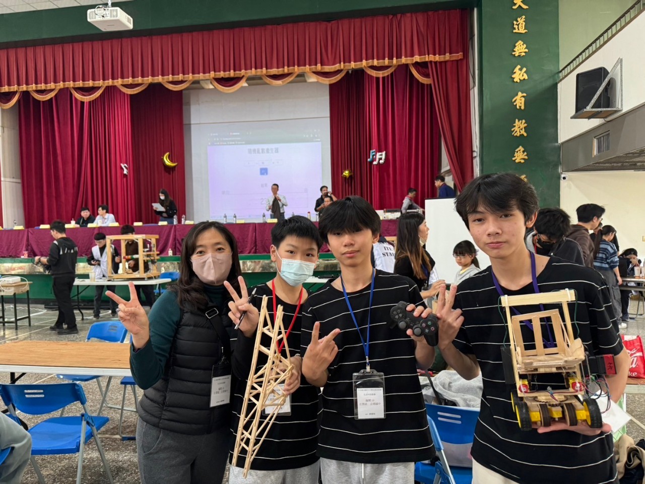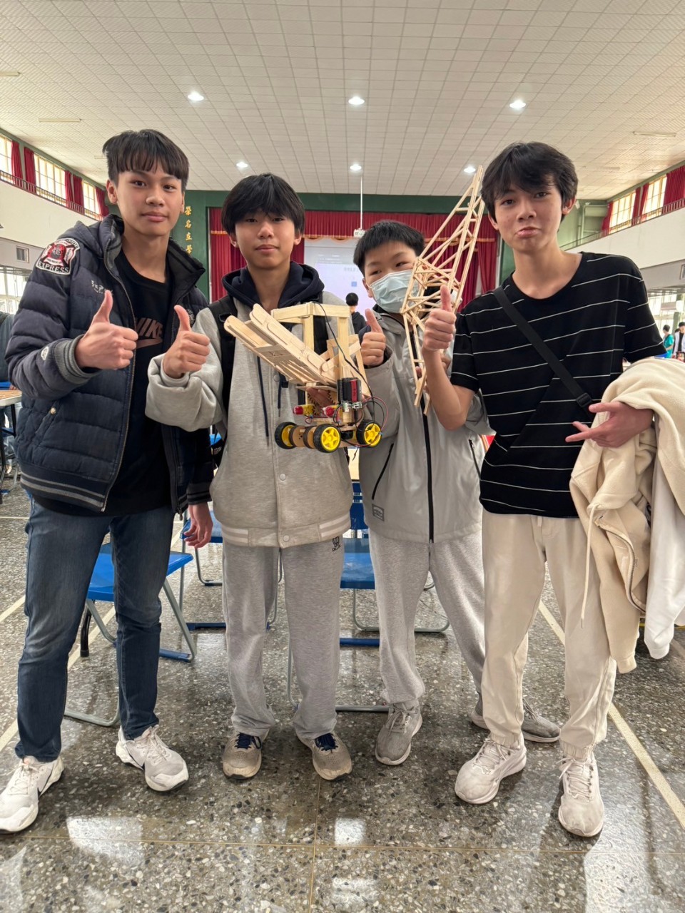 113學年度生科競賽於114.01.18比賽完畢,孩子們的表現真的很棒,車子部份拿到滿分,橋的載重比也在我們的練習水準之上。謝謝華真及紳農兩位導師的支持與顧勵,謝謝治平教練,感謝所有關心生科競賽的夥伴